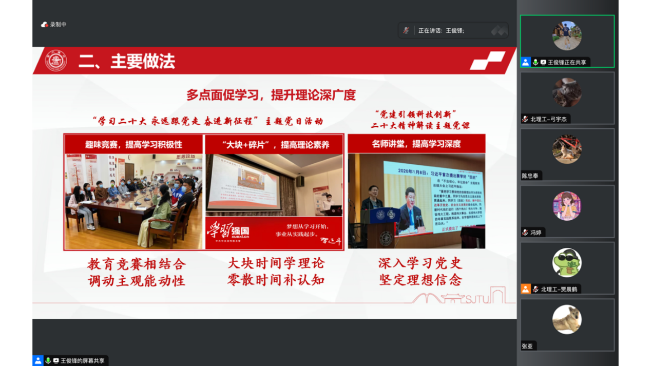 宣讲结束后,王俊锋作《以时事政治出发引导党员懂校史、学党史、强信念系列党日活动经验分享》主题分享,介绍了凝固博士生党支部的基本情况,并分享了支委会基于支部实际情况与存在问题,从“多模式新理念,开拓党日活动新体验”、“多点面促学习,提升理论深广度”、“观展览悟精神,沉浸式学习促飞跃”等方面开展党日活动的经验方法,表示通过系列党日活动的举办,增强了支部党员对党的认同感,坚定了“爱国荣校”的信念。他强调了活动的设计要具有针对性、趣味性和启发性,每个月党日活动的举办要有梯度,形成系统的知识学习,从而激发支部党员的主动学习和参与热情。