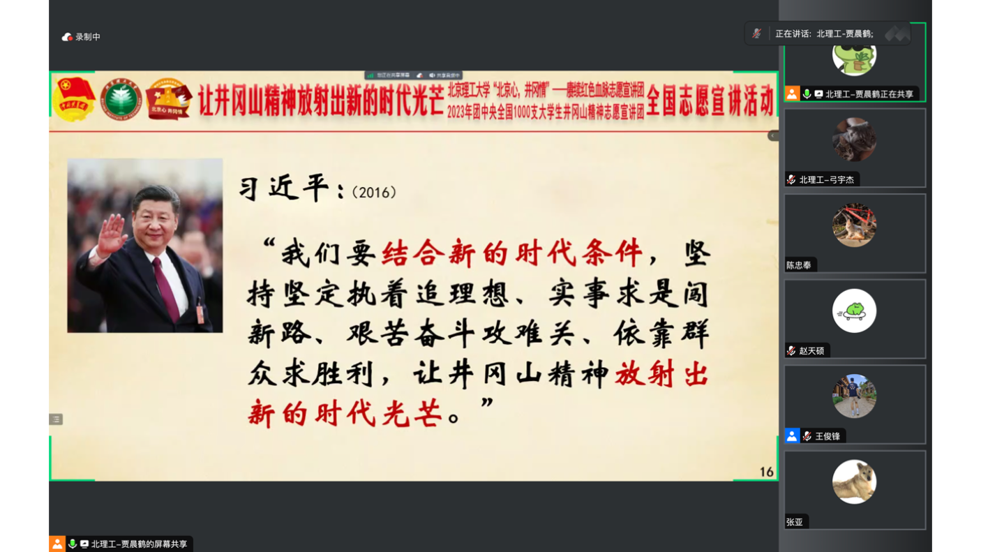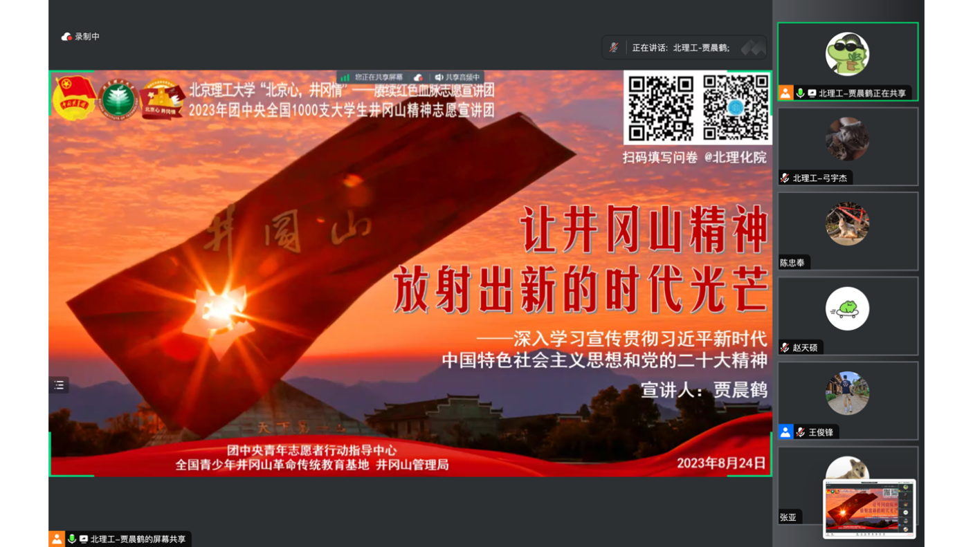 本次北京理工大学志愿宣讲团的同学们从我党扎根井冈山的历史出发,结合着许多革命先烈的英雄事迹与战略方针,向我们阐释了井冈山精神的深刻内涵,并联系自身,对如何把井冈山精神运用到现阶段的学习、科研工作中做了更为充分的讲解,使我获益匪浅。