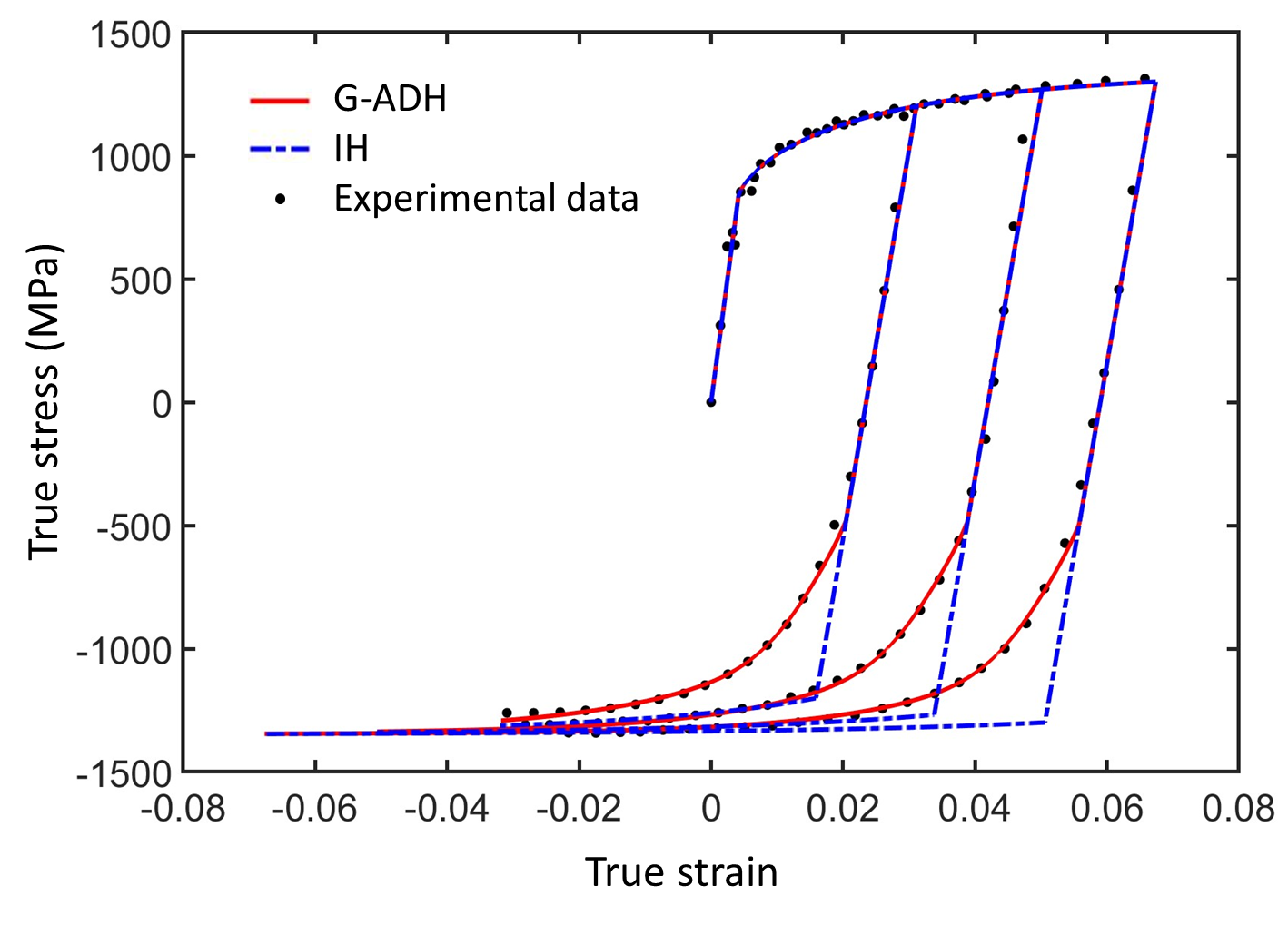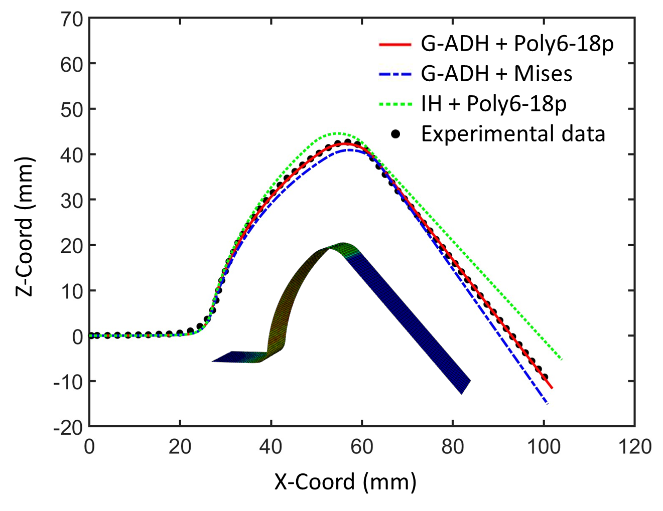 金属薄板在实际塑性加工过程中加载路径复杂,在经历加载、卸载、再加载或应变路径变化时,会产生包辛格效应、硬化迟滞、交叉硬化等复杂力学响应。板料冲压成形在卸载后由于残余应力引起的回弹也难以避免。此外,复杂非线性加载对金属板料的成形极限(包括颈缩和断裂)也有显著影响。为有效预测回弹和精确预测成形极限,亟需解决路径相关的各向异性机理及本构关系。针对ADH2022扭曲硬化模型(Int. J. Plast., 2022, 151, 103214)预测屈服轨迹曲率偏大的问题,在国家重点研发项目(2023YFB2504604)、国家自然科学基金项目(92160206)和上海市浦江人才项目(23PJ1405200)的资助下,提出了可以耦合任意屈服模型的广义各向异性扭曲硬化模型G-ADH,并精确预测了TRIP1180 的U型拉深回弹。